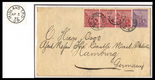 136 : width="300p" alt="image" ></a></cfif>Cape of Good Hope Mail to Germany 1892 (2 Apr.) envelope to Hamburg, bearing 1d. carmine-red (3) and 6d. purple thrice cancelled by fine "midland t.p.o./up" c.d.s., arrival c.d.s. (23.5) on reverse; clean and