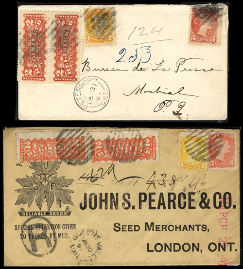 137 : envelope from Queen´s Valley, Man. to London, Ont., each franked with 2c. orange (2) in combination with Small Queen 1c. and 3c., all cancelled with circle of bars and showing despatch c.d.s. on face, the first with arrival d.s. showing "89" year