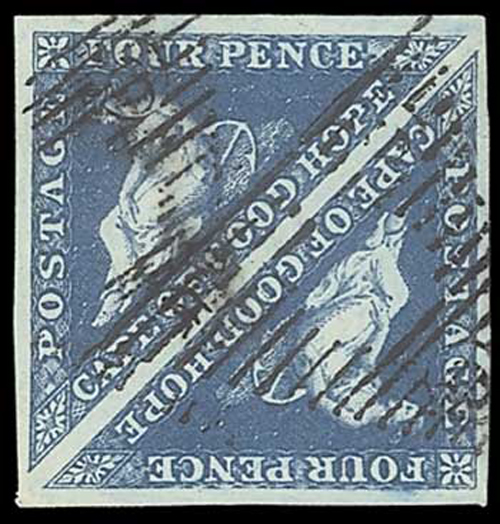 136 : SRC="https://d3ums4016ncdkp.cloudfront.net/auction/main/7021/7021_1133_1.jpg" width="300p" alt="image" ></a></cfif>Cape of Good Hope Triangular Issues 1853 Deeply Blued Paper 4d. deep blue pair with good to large margins; fine and attractive.
