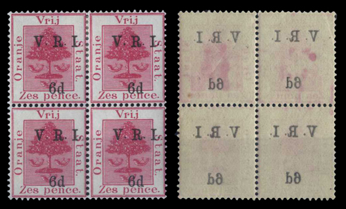 136 : SRC="https://d3ums4016ncdkp.cloudfront.net/auction/main/7021/7021_1731_1.jpg" width="300p" alt="image" ></a></cfif>x Orange Free State 1900 V.R.I. Issue, Subsequent Printings 6d. bright carmine blocks of four (2), one with clear offset of surcharge