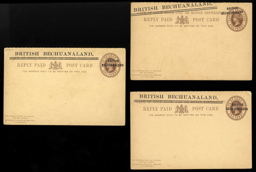 136 : SRC="https://d3ums4016ncdkp.cloudfront.net/auction/main/7025/7025_1276_1.jpg" width="300p" alt="image" ></a></cfif>THE BECHUANALANDS British Bechuanaland Postal Stationery Postcards and Reply Paid Cards 1892 1d.+1d. brown (3), one with the reply
