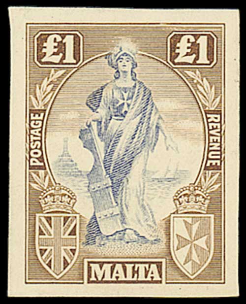 136 : width="300p" alt="image" ></a></cfif>Malta 1922 (c.) Melita £1 imperforate printer´s sample in ultramarine and brown on unwatermarked paper; fine and scarce, particularly so without the Specimen overprint. Photo Estimate £ 100-120<A