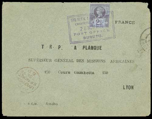 137 : 4) 1898 (26 Nov.) envelope written at Assaba ex the "Planque" correspondence to Lyon, France, bearing GB 2 1/2d. tied by very fine strike of datestamp in violet and showing red Paid Liverpool Br. Packet transit d.s. (17.12). Photo Estimate £