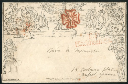 136 : width="300p" alt="image" ></a></cfif>Great Britain 1840 Mulready One Penny Envelopes A161, from Blackheath to Russell Square, red Maltese Cross cancellation with "T.P/Blackheath Sth" alongside, framed red 1840 (14 May) d.s. on reverse; small part