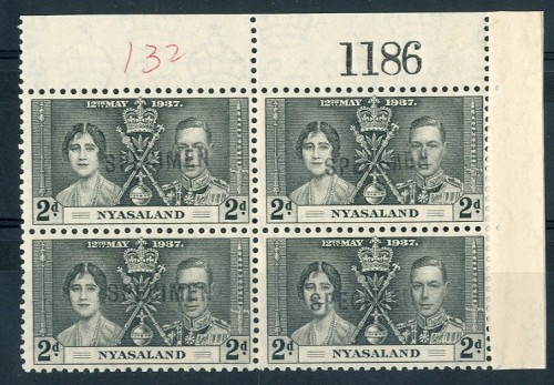 139 : 2d. grey-black block of four from the upper right corner with sheet number "1186", each handstamped "specimen" (Type 3); very fine. Photo Estimate £ 500-600<A HREF="https://d3ums4016ncdkp.cloudfront.net/auction/main/11001/11001_449_1.jpg"
