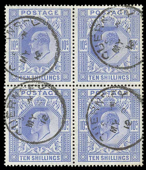 136 : SRC="https://d3ums4016ncdkp.cloudfront.net/auction/main/11018/11018_1208_1.jpg" width="300p" alt="image" ></a></cfif>Great Britain King Edward VII 1911-13 Somerset House 10/- bright blue, block of four cancelled by large Guernsey c.d.s.; fine and