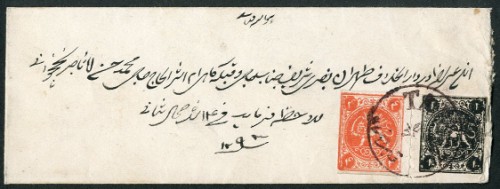 136 : SRC="https://d3ums4016ncdkp.cloudfront.net/auction/main/11028/11028_2223_1.jpg" width="300p" alt="image" ></a></cfif>Iran 1875 Rouletted Issue 1(sh.) black and 4(sh.) red, tied by Tabriz datestamp of 6 July to envelope addressed to Teheran, fine.