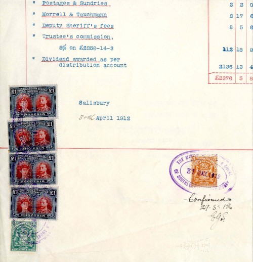 136 : SRC="https://d3ums4016ncdkp.cloudfront.net/auction/main/11033/11033_1930_1.jpg" width="300p" alt="image" ></a></cfif>x Rhodesia 1910-13 Double Head Issue Revenue Usage 1912 (31 May) "Liquidation Account" bearing £1 (4) and 1898-1908 5/- and