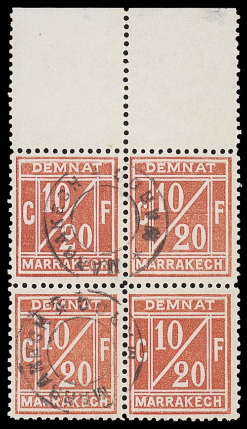 136 : SRC="https://d3ums4016ncdkp.cloudfront.net/auction/main/11037/11037_112_1.jpg" width="300p" alt="image" ></a></cfif>Morocco Local Posts Demnat to Marrakech 1906 10/20c. claret (lie-de-vin), block of four from the top of the sheet, neatly