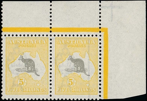 136 : SRC="https://d3ums4016ncdkp.cloudfront.net/auction/main/12046/12046_268_1.jpg" width="300p" alt="image" ></a></cfif>AUSTRALIAN COMMONWEALTHKangaroo Issued StampsThird WatermarkFive Shillings5/- grey and yellow, a top right corner pair [R5-6], fine
