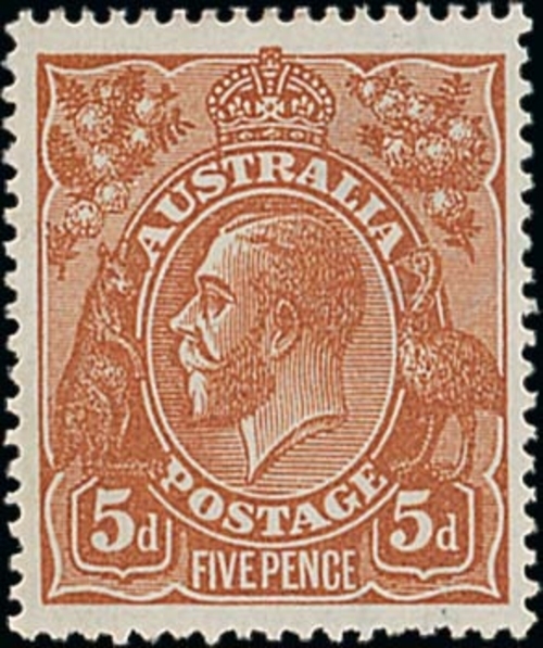 136 : SRC="https://d3ums4016ncdkp.cloudfront.net/auction/main/12046/12046_568_1.jpg" width="300p" alt="image" ></a></cfif>AUSTRALIAN COMMONWEALTHKing George V HeadsFive PenceSingle Watermark, Line Perf. 14¼5d. brown, variety watermark inverted, fine mint.