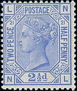 136 : SRC="https://d3ums4016ncdkp.cloudfront.net/auction/main/12049/12049_223_1.jpg" width="300p" alt="image" ></a></cfif>Great Britain1880-83Watermark Imperial Crown2½d. blue, Plate 21: NL, centred to top right; fresh colour, unmounted mint. S.G. 157,
