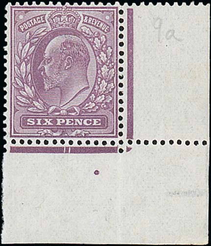 136 : SRC="https://d3ums4016ncdkp.cloudfront.net/auction/main/12049/12049_322_1.jpg" width="300p" alt="image" ></a></cfif>Great BritainKing Edward VII Issues1911-13 Somerset House6d. flourescent ink, dull violet, unmounted mint from the lower-right corner