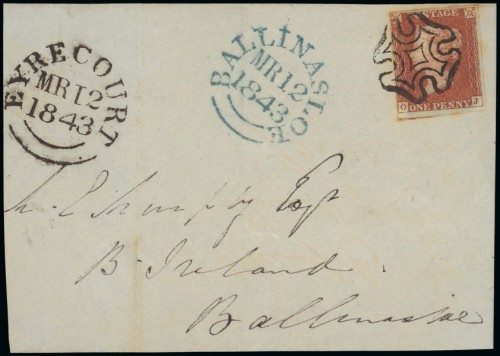 137 : at foot, tied to front dated 12 March 1843 addressed to Ballinasloe by a superb strike of the distinctive Maltese Cross of Eyrecourt, dated markings in blue and black, the adhesive with a few light stains, fine Estimate £ 400-500<A
