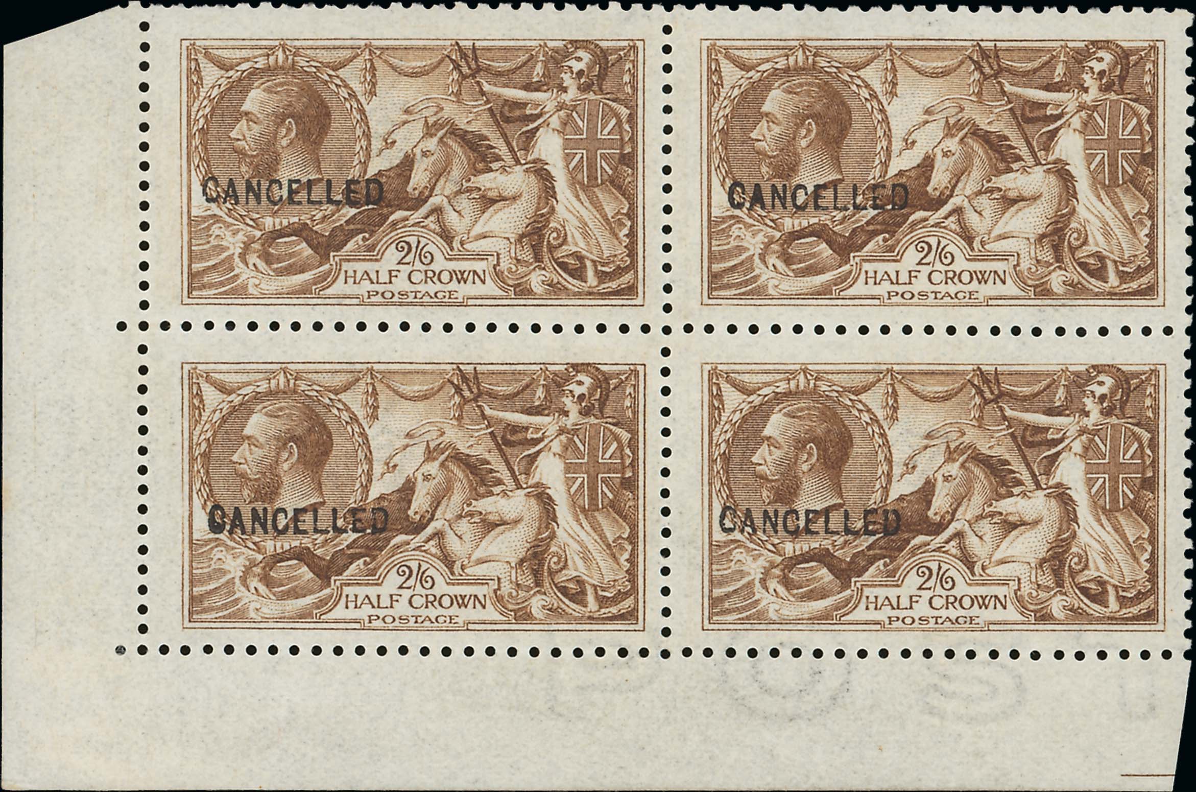 137 : corner block of four, each overprinted "cancelled" (Type 24), large part gum, the upper left stamp with some short perfs, otherwise very fine and fresh. S.G. Spec. N64t, £4,800+ Estimate £ 2,000-2,500 provenance: H. Shaida, April
