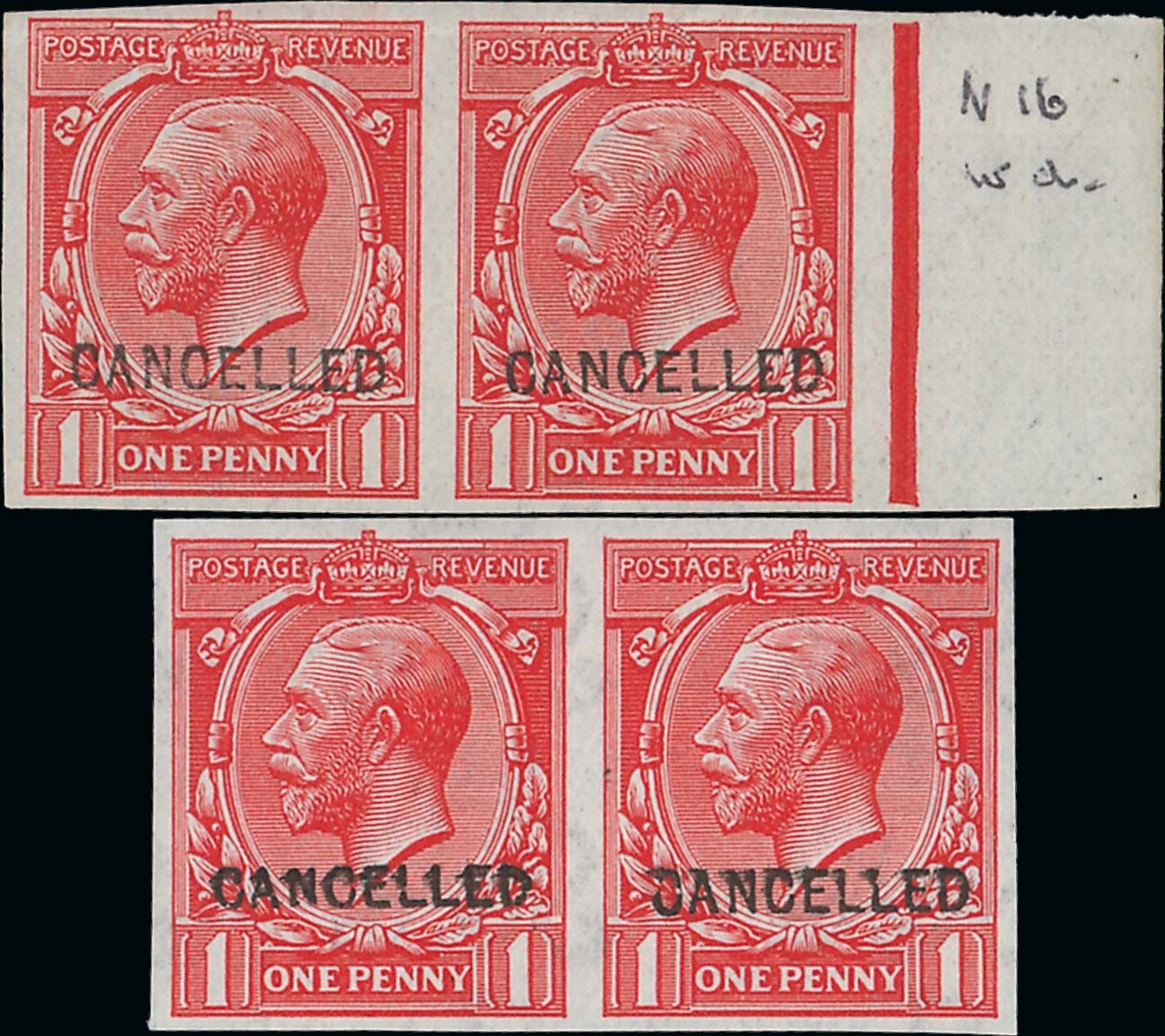 137 : shades, one with margin at right, each overprinted "cancelled" (Type 24), fine mint. S.G. Spec. N16x, £180 Estimate £ 60-80<A HREF="https://d3ums4016ncdkp.cloudfront.net/auction/main/12014/12014_708_1.jpg" target="_blank">