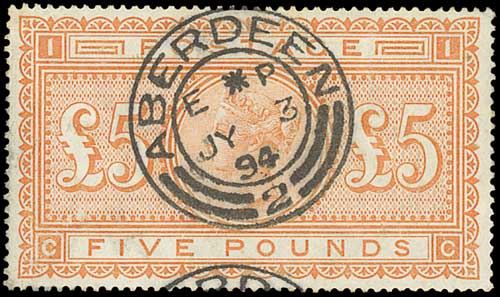 136 : SRC="https://d3ums4016ncdkp.cloudfront.net/auction/main/12016/12016_1239_1.jpg" width="300p" alt="image" ></a></cfif>Great Britain1867-83White Paper£5 orange, CC with a bold strike of double-ring Aberdeen c.d.s. dated 1894 (3 July) with code