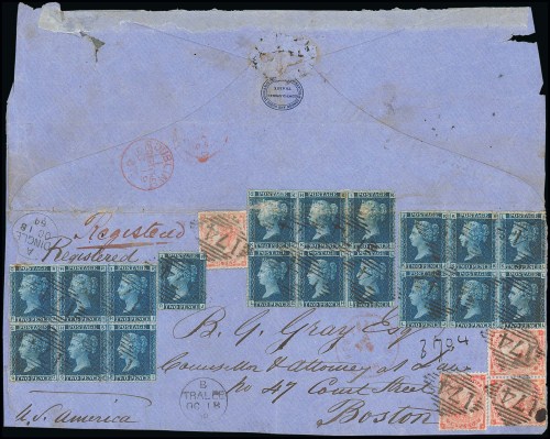 registered from Dingle, Ireland to Boston, bearing 2d. plate 9, nineteen examples (three blocks of six KG-LI, KJ-LL, RG-SI and a single RJ) and 1862-64 4d. pale red, plate 4 with hairlines, (two singles and a pair) tied by "174" obliterator, front