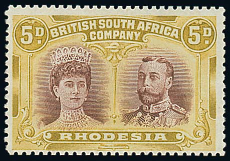 136 : SRC="https://d3ums4016ncdkp.cloudfront.net/auction/main/12038/12038_175_1.jpg" width="300p" alt="image" ></a></cfif>RHODESIA1910-13 Double Head IssueIssued Stamps - Perforated 14Five PenceS.G. 141ab, Purple-brown and Ochre, Thick Ear printingA