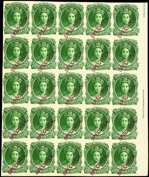 138 : (5x5) on card, overprinted in carmine, the top block of fifteen Type B se-tenant with the lower block of ten Type C; one with small defect at foot, otherwise fine and a unique multiple. Cat. $15,000. Photo<A