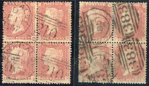 136 : SRC="https://d3ums4016ncdkp.cloudfront.net/auction/main/13044/13044_675_1.jpg" width="300p" alt="image" ></a></cfif>(x) Great Britain1856-58Watermark Large Crown, Perforation 14 (C9)1d. Plate 27 SA-TB and Plate 41 SG-TH, used blocks of four, some