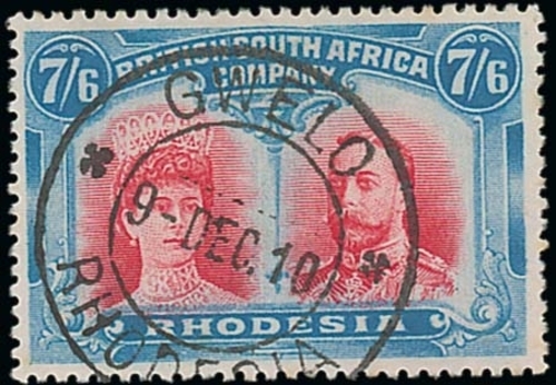 136 : SRC="https://d3ums4016ncdkp.cloudfront.net/auction/main/13011/13011_2365_1.jpg" width="300p" alt="image" ></a></cfif>Rhodesia1910-13 Double Head IssuePerforated 147/6d. carmine and light blue, neatly cancelled by Gwelo December 1910 c.d.s., fine and