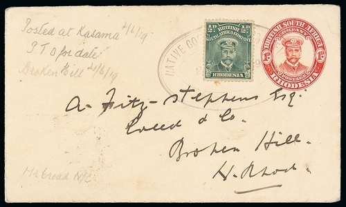 136 : SRC="https://d3ums4016ncdkp.cloudfront.net/auction/main/13011/13011_2465_1.jpg" width="300p" alt="image" ></a></cfif>RhodesiaCovers and Cancellations1919 (June) 1d. red stationery envelope, uprated with Admiral ½d., from Kasama to Broken Hill,