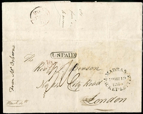 137 : "madras/packet letter" (19.3) and framed "unpaid" in black with faint London arrival; clean and fine. A long missionary letter. Photo<A HREF="https://d3ums4016ncdkp.cloudfront.net/auction/main/13022/13022_503_1.jpg" target="_blank">