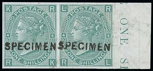 136 : SRC="https://d3ums4016ncdkp.cloudfront.net/auction/main/13026/13026_368_1.jpg" width="300p" alt="image" ></a></cfif>Great Britain1867-801/-green, Plate 4, RK-RL, horizontal pair from the right of the sheet overprinted "specimen" type 6, unused