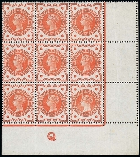 136 : SRC="https://d3ums4016ncdkp.cloudfront.net/auction/main/13026/13026_468_1.jpg" width="300p" alt="image" ></a></cfif>Great Britain1887-92½d. vermilion in a corner block of nine, control "Q"with error, vertical comb, mint; some wrinkling and creasing