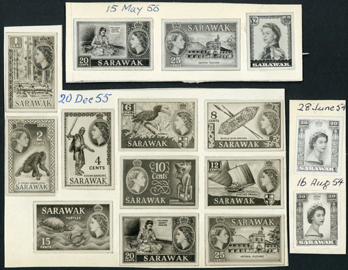 138 : dates into the archive record booksSarawak1954 (28 June-16 Aug.) 30c. (2), 1955 (20 Dec.) 1c. to 25c. set of ten, 1956 (15 May) 20c., 25c., $2, all similar to issued designs<A