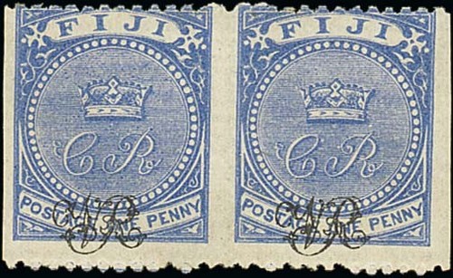 136 : SRC="https://d3ums4016ncdkp.cloudfront.net/auction/main/14027/14027_1235_1.jpg" width="300p" alt="image" ></a></cfif><b>imperforate vertically.</b> (x) Fiji1876-77 laid paper, 1d. blue horizontal pair, variety imperforate vertically, fresh and fine