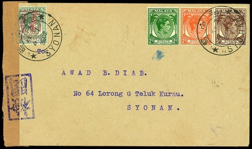 137 : 8c. grey with double frame chop, the 2c. green uncancelled, the others by bi-lingual Syonan c.d.s. Photo provenance:Milo D. Rowell, June 1999<A HREF="https://d3ums4016ncdkp.cloudfront.net/auction/main/14015/14015_1670_1.jpg" target="_blank">
