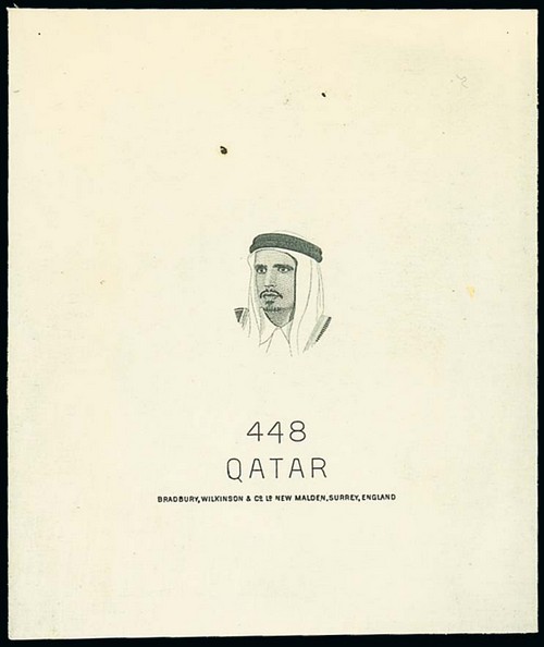 137 : Ahmad bin Ali al-Thani head unframed (61mm x 72mm), die number "448" and "qatar" below, slight soiling otherwise fine. Photo Subject to 20% VAT on Buyer’s Premium. For more information please view Terms and Conditions for Buyers.<A
