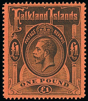 136 : SRC="https://d3ums4016ncdkp.cloudfront.net/auction/main/14025/14025_554_1.jpg" width="300p" alt="image" ></a></cfif>Falkland Islands1912-20 MCA £1 black on red, fresh and fine mint. S.G. 69, £550. Photo Subject to 20% VAT on Buyer’s
