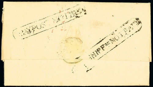 137 : redirected to Poona, marked "P9" and with London Paid datestamp on face, the reverse showing framed "bbay post not paid" (HG5) and "bbay ship pge not paid" (HGSD1) across join. Photo<A