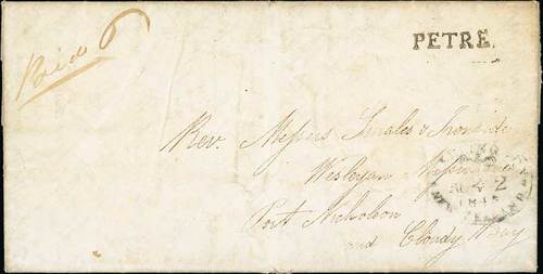 137 : (22 June) entire letter from Waimate Mission Station by Maori runner via Petre to Wellington, marked "Paid 6" and showing a superb strike of the "petre." handstamp with stop and with Crowned Wellington arrival oval datestamp (2.8) below. The earliest