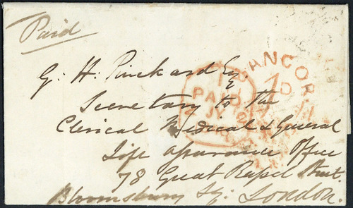 137 : Universal Penny Postage handstamp, red London tombstone arrival on the front, dated markings on reverse; rare Subject to 20% VAT on Buyer’s Premium. For more information please view Terms and Conditions for Buyers.<A