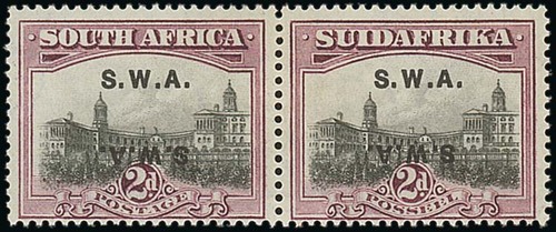 137 : grey and maroon bi-lingual pair, variety overprint double, one inverted, large part original gum, fine and scarce. S.G. 60cb, £600. SACC R13,000. Photo Subject to 20% VAT on Buyer’s Premium. For more information please view Terms and Conditions