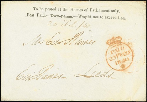 under inscription, setting 1, on Britannia watermarked paper, addressed to Leeds with crowned Paid despatch c.d.s. in red, the reverse with black wax seal "house of commons". Fine and rare. Only thirteen covers recorded. S.G. PE3b, £45,000.