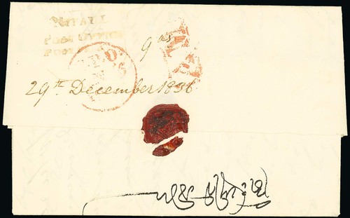 137 : Anglo-Indian scholar in Calcutta, on reverse a good strike of the octagonal "Nepaul/Post Office/Paid" marking (Hellrigl B1), rated "9as" in manuscript, red Calcutta arrival and framed "AM" marking alongside; fine and rare. The latest recorded use of