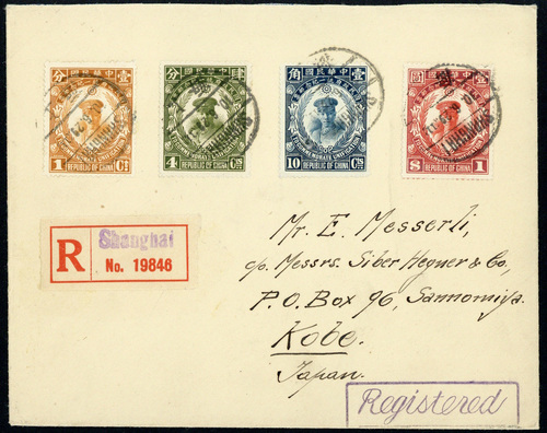 136 : SRC="https://d3ums4016ncdkp.cloudfront.net/auction/main/15026/15026_253_1.jpg" width="300p" alt="image" ></a></cfif>(x) China1929 Unification of China 1c. to $1 set of four on envelope registered to Kobe, each value tied by Shanghai c.d.s., 1929 (6