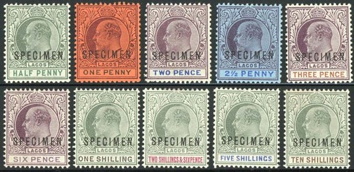 136 : SRC="https://d3ums4016ncdkp.cloudfront.net/auction/main/15030/15030_3479_1.jpg" width="300p" alt="image" ></a></cfif>Lagos1904 ½d. to 10/- set of ten, overprinted "specimen", fresh mint. S.G. 44-53, £225 Subject to 20% VAT on Buyer’s Premium.