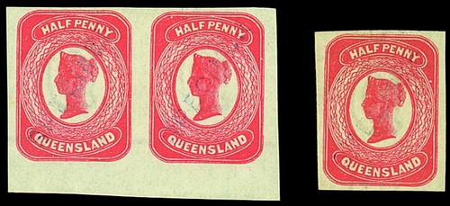 137 : in carmine and a single on ungummed watermark Crown over Q upright paper, each handstamped "specimen" diagonally in blue. Photo Subject to 20% VAT on Buyer’s Premium. For more information please view Terms and Conditions for Buyers.<A