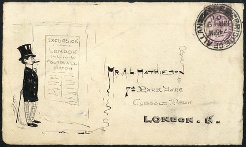 mostly Victorian, hand-illustrated envelope fronts by the famous cartoonist and engraver John Mathieson addressed to various members of his family and arranged in an album; topics include art, football, rail, travel and many are satirical. Generally