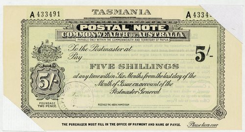 136 : SRC="https://d3ums4016ncdkp.cloudfront.net/auction/main/16044/16044_485_1.jpg" width="300p" alt="image" ></a></cfif>(x) Postal Notesc.1937 5/- with C of A watermark, code letter added before Serial Number, "scottsdale/28 se 47/tas. aust." c.d.s.; two