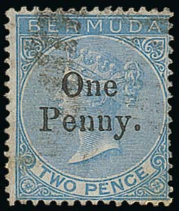 136 : SRC="https://d3ums4016ncdkp.cloudfront.net/auction/main/16010/16010_24_1.jpg" width="300p" alt="image" ></a></cfif>(x) The Ric Otton Collection of British CommonwealthBermuda1875 "One/Penny." on 2d. dull blue, lightly cancelled, fine used. S.G. 15,