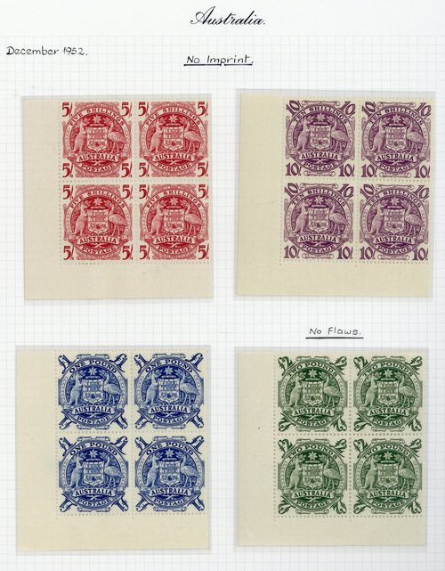 136 : SRC="https://d3ums4016ncdkp.cloudfront.net/auction/main/16025/16025_108_1.jpg" width="300p" alt="image" ></a></cfif><b>Definitive Issues.</b> (x) AustraliaDefinitive Issues1949-50 Arms5/-, 10/-, £1 and £2, each in a lower left corner block