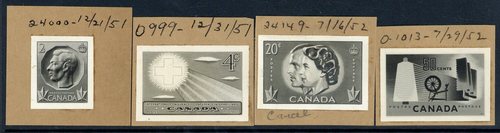 137 : comprising King George VI 2c. "12/21/51"12/31/51", 20c. The Queen and Duke of Edinburgh (possibly for the Royal Visit issue) "7/16/52" and 50c. Textile Industry (very close to that issued) "7/29/52". A unique quartet<A