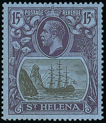 136 : SRC="https://d3ums4016ncdkp.cloudfront.net/auction/main/16027/16027_1329_1.jpg" width="300p" alt="image" ></a></cfif>St. Helena1922-37 Badge of the Colony IssueMultiple Script CA Watermark15/- grey and purple on blue, fine unmounted mint. S.G. 113,